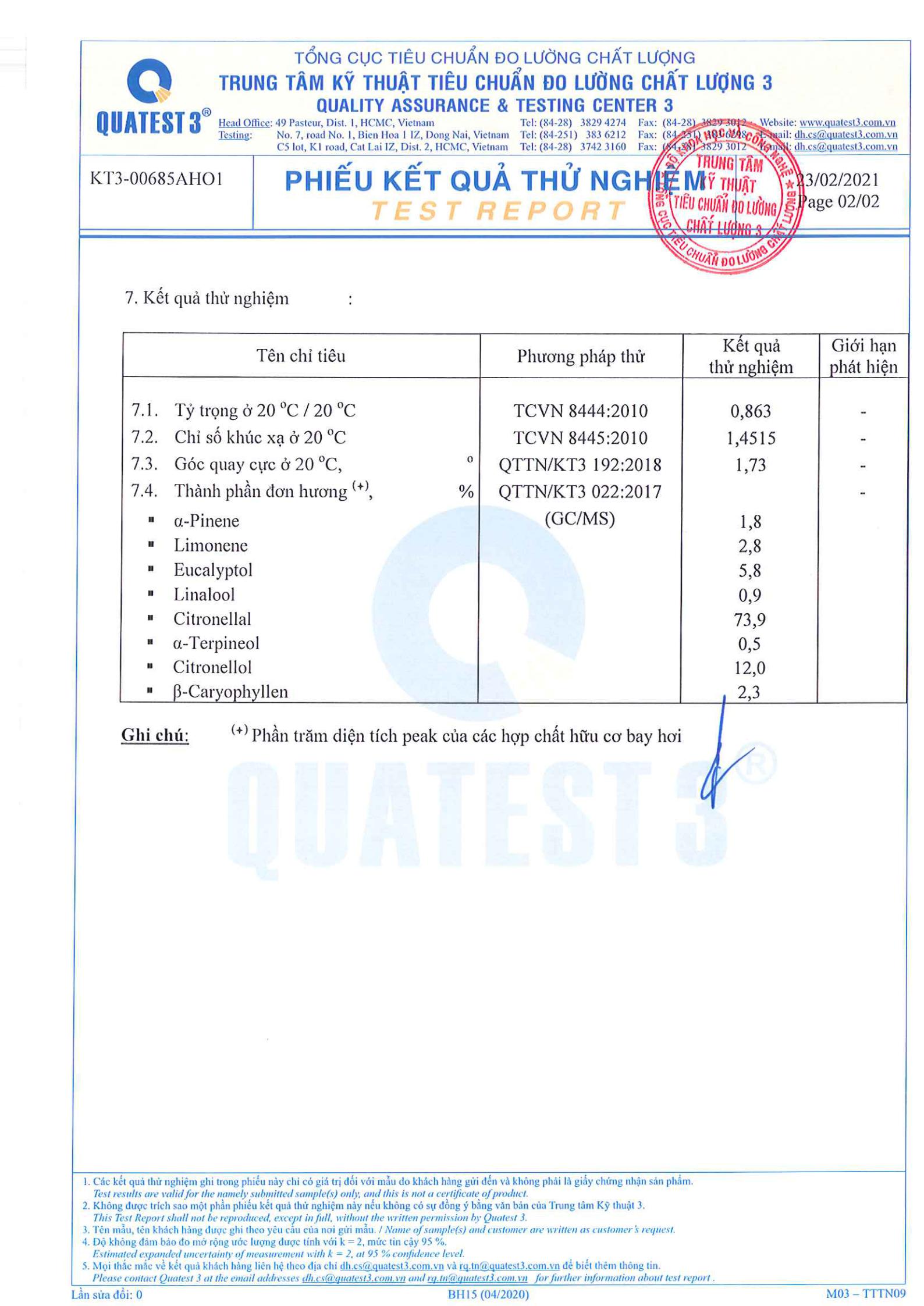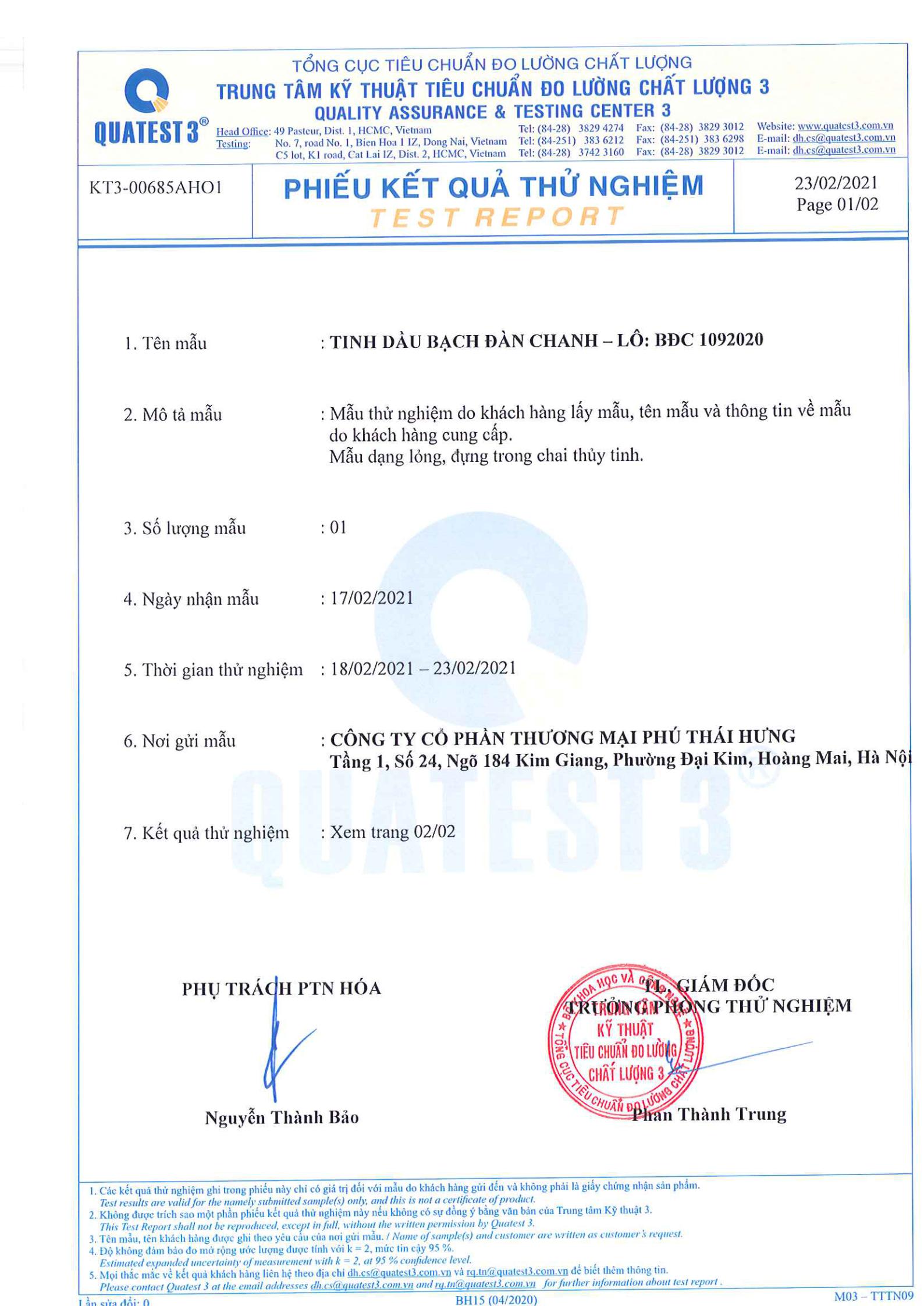 KẾT QUẢ KIỂM NGHIỆM TINH DẦU BẠCH ĐÀN CHANH
