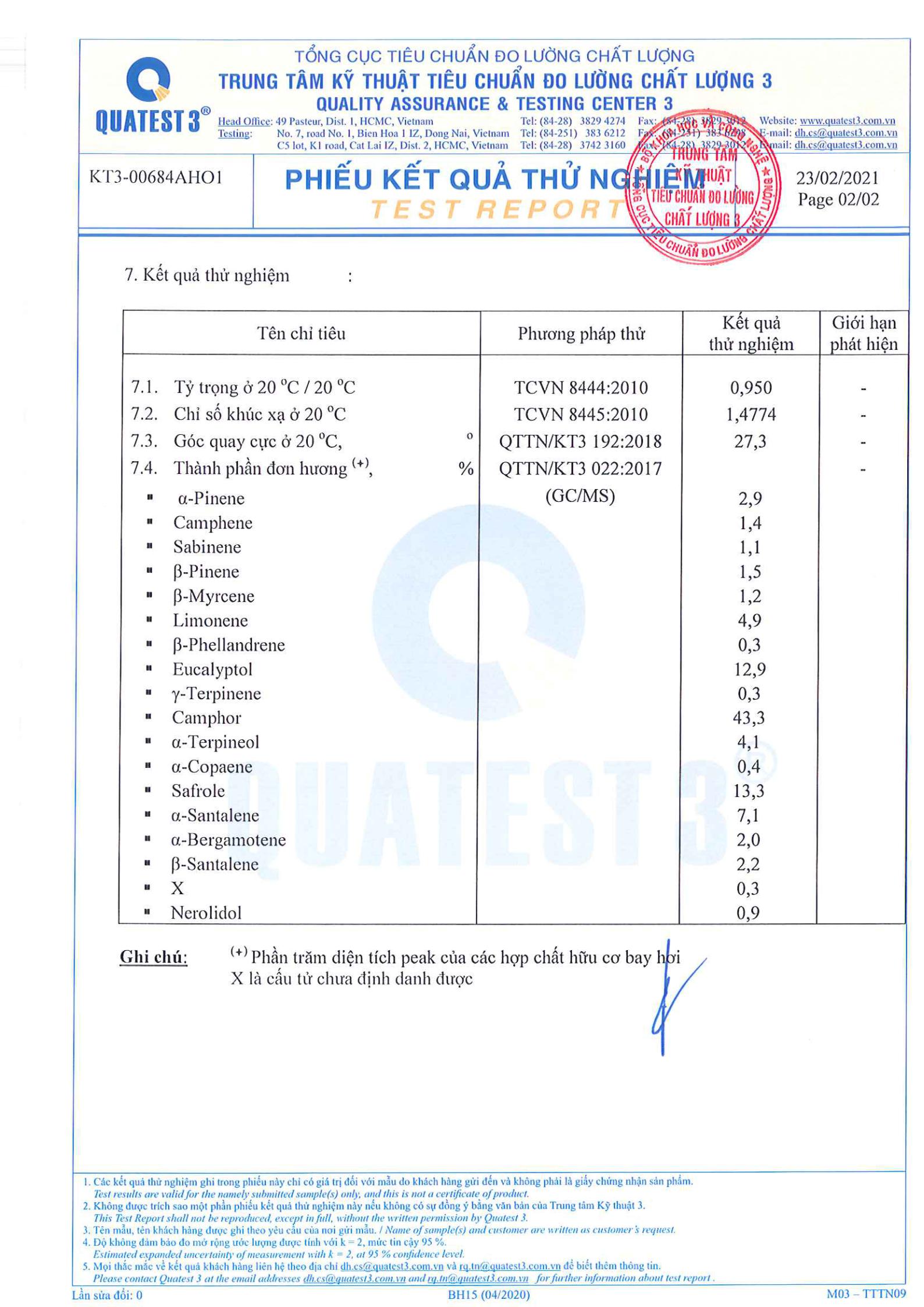 KẾT QUẢ KIỂM NGHIỆM TINH DẦU LONG NÃO