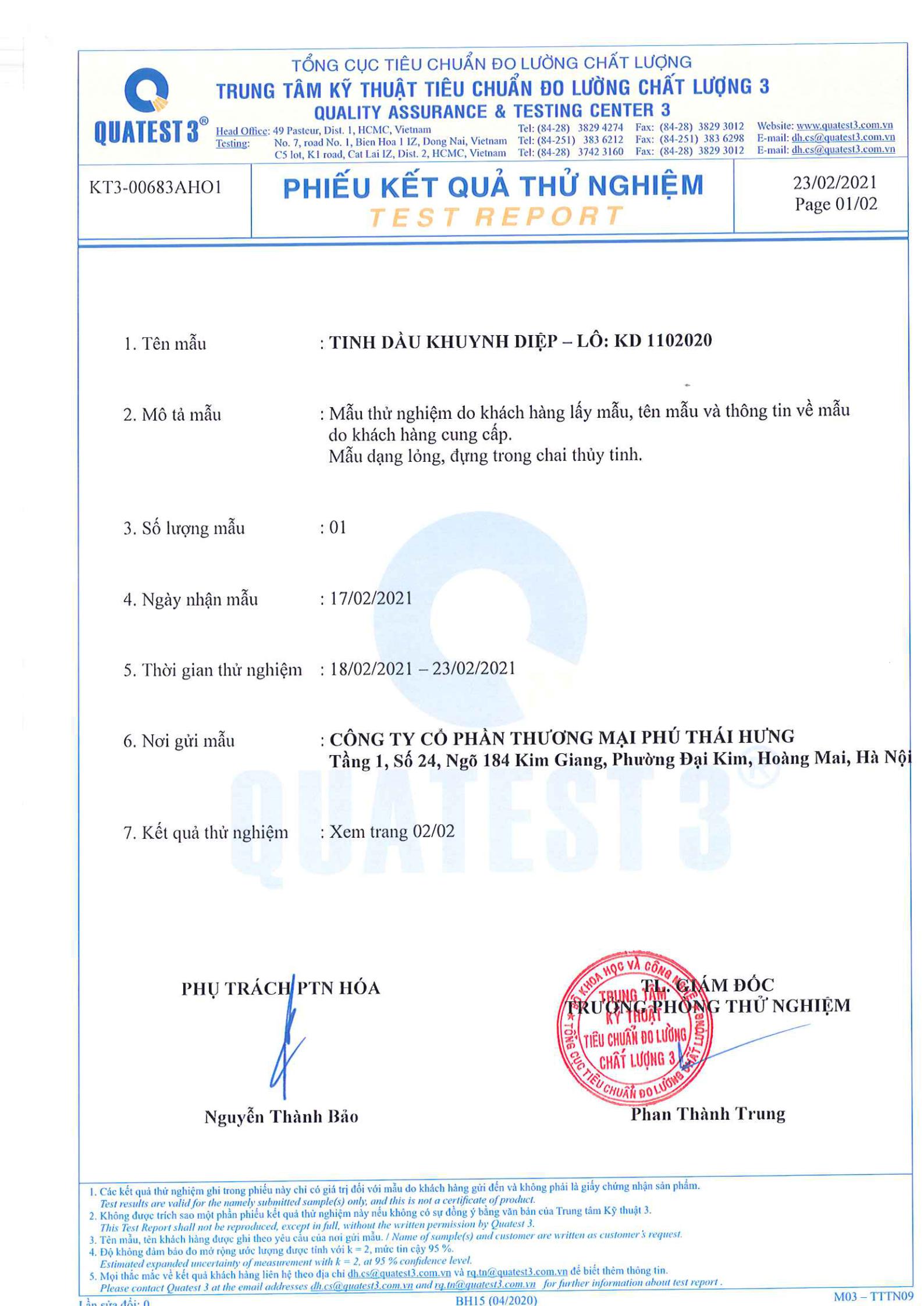 KẾT QUẢ KIỂM NGHIỆM TINH DẦU KHUYNH DIỆP